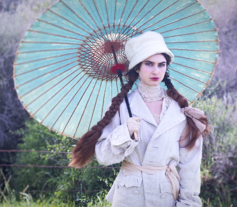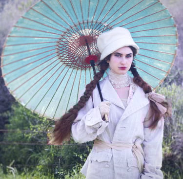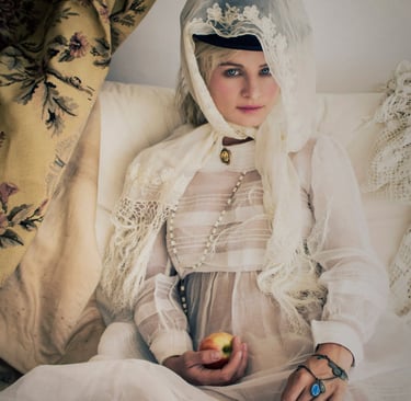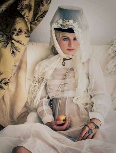 My aesthetic evolves from my theatrical background, knowledge of costume, experience in film and television and appreciation of history. I love to shoot in textured locations, make my own backdrops and have an extensive collection of costumes which I use to style my subjects when required.